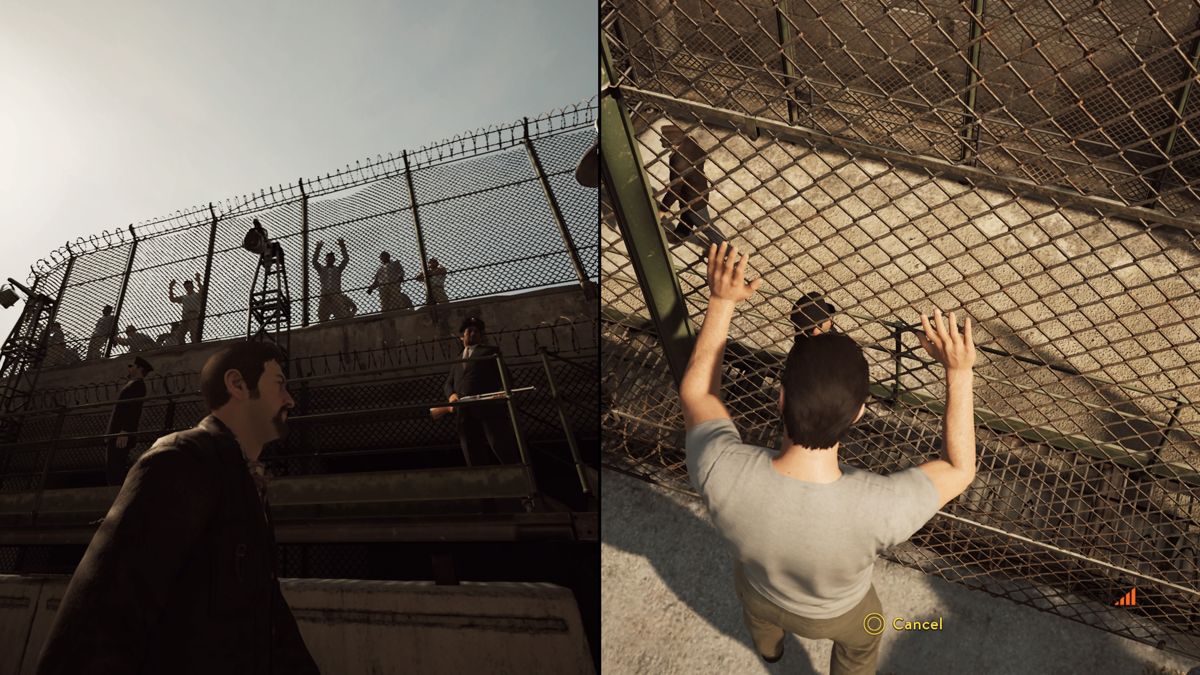 Partindo agora para o jogo em questão, A Way Out apresenta na trama dois protagonistas, Leo e Vicent, que iniciam sua jornada presos e juntos estabelecem uma relação de cumplicidade na tentativa de escapar da prisão. Antes de jogar eu acreditava que o jogo focava apenas nessa fuga da prisão como o título do game dá a entender. Mas quando você finaliza o jogo é possível estabelecer outros significados para essa expressão do título. Para me aprofundar na história eu tenho que falar antes da jogabilidade única do game que se dá no modo cooperativo em splitscreen, primordialmente. E essa ideia de só poder jogar com outra pessoa dá ao jogo uma boa imersão e relação de companherismo, mesmo que algumas vezes a jogabilidade se torne meio repetitiva em alguns pontos, com uma dependência desnecessária do seu companheiro para continuar por um caminho, por exemplo. Mesmo assim eu não achei o jogo tão fechado de um jeito que incomodasse. A linha narrativa está sempre lá, mas em muitos cenários nós temos a possibilidade de explorar a região e pararmos em muitos minigames divertidos para fugir um pouco do rumo central da história. Outra coisa que me agradou bastante foram os diferentes estilos de gameplay que me surpreenderam ao longo da duração do game. Há como dirigir carros, motos, barcos, fazer tirolesa, escalada, pescar, jogar baseball e até mesmo se equilibrar numa cadeira de rodas, se é que isso faz algum sentido. A questão da tela dividida é muitas vezes utilizada pelo jogo para criar situações completamente diferentes para os dois personagens e isso cria diferentes configurações inusitadas de avançar no jogo. Por essa diversidade, a gameplay ainda se destaca um pouco, mas em geral ela é meio simplória, com puzzles de tempo ou outras coisinhas bem básicas.